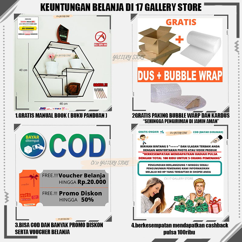 Keunggulan: Ringan dan Kokoh. Sehingga ongkos pengiriman tak akan membebani Anda. Harga Paling Murah. Dengan harga yang murah Anda akan memperoleh kualitas rak dinding terbaik dari kami. Sesuai untuk berbagai Dekorasi Ruangan.