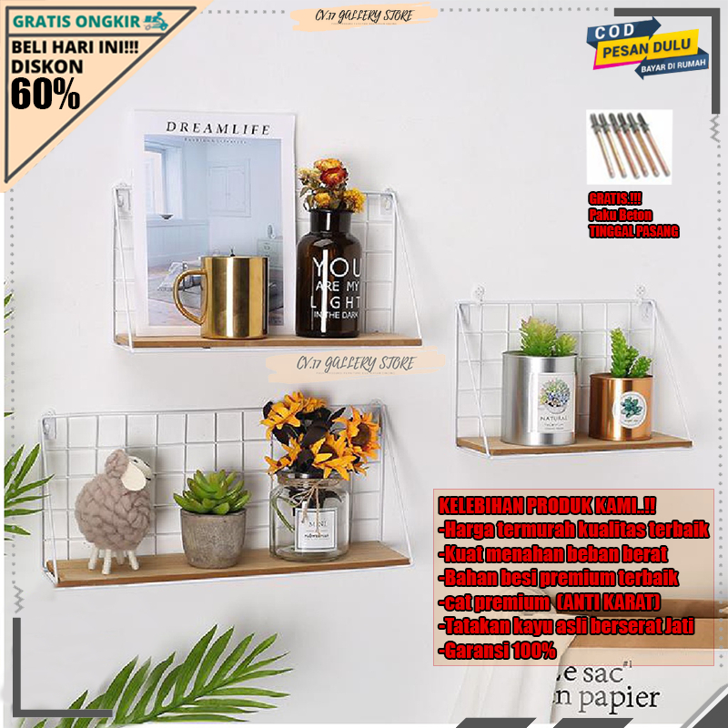 Rak Hiasan Gantung Dinding Tempel Besi Plus Papan Kayu Ambalan Tempel Tempat penyimpanan Serbaguna Buku Bunga Makeup Kosmetik make up Alat Tulis Bumbu Dapur Decorasi Dekorasi Dinding Dingding Tembok Ruang Tamu Kamar Tidur Cowok Minimalis Aesthetic
