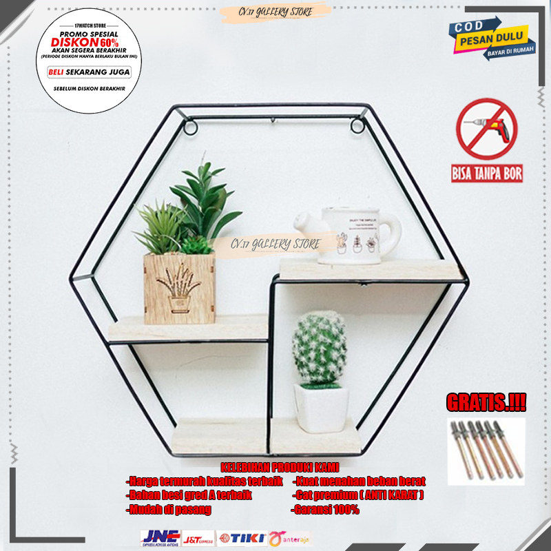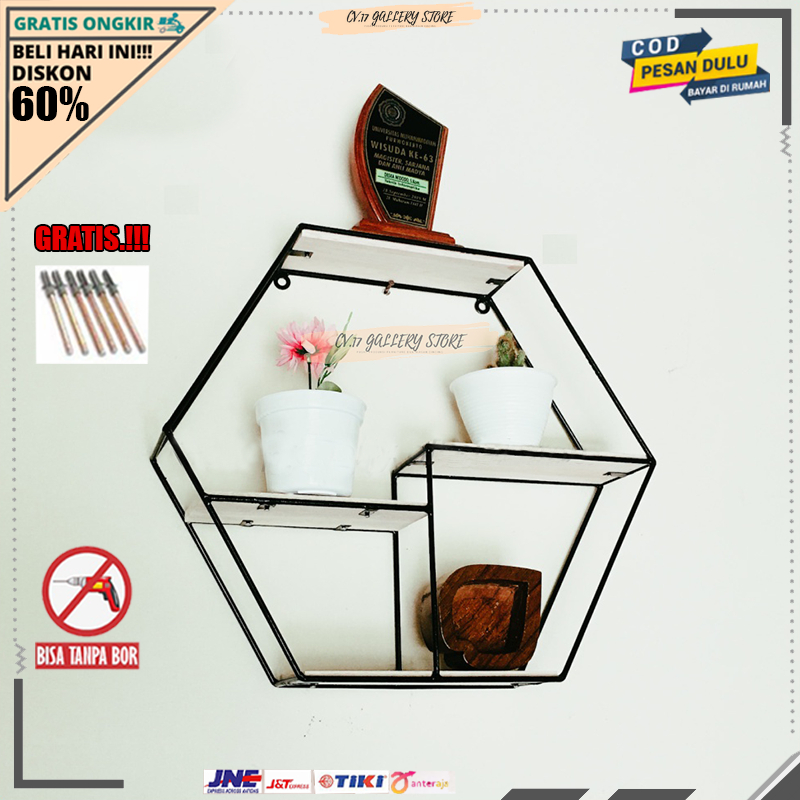 Perlengkapan Rumah > Furniture > Rak & Rak Gantung > Rak Hiasan Segi lima 5 Hexagonal Ambalan Besi Hexagon Gantung Besi Tempel Tempat penyimpanan Buku Bunga Kosmetik make up Makeup Bumbu Dapur Dekorasi Decorasi Dinding Dingding Ruang Tamu Kamar Tidur Cowok Cewek Kayu Jati Belanda Susun Serbaguna Minimalis