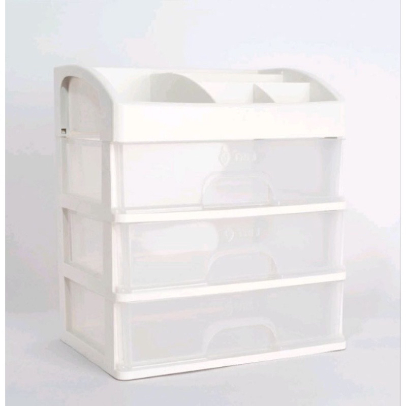 Rak multifungsi yang bisa digunakan untuk menyimpan /merapikan kosmetik dan aksesoris yang dipunya. Terdapat 3 laci yang bisa digunakan untuk menyimpan make up dan perhiasan sehingga terlindungi dari debu. Terdapat sekat dibagian atas seperti foto.