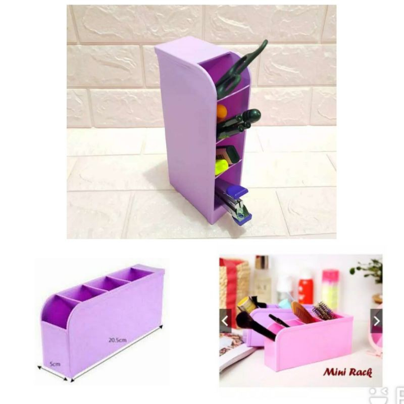 Mini rack adalah rak mini yang dalamnya terdapat 4 sekat, fungsinya bisa untuk tempat sendok garpu, alat-alat tulis, tempat kosmetik dan aksesoris atau rak untuk merapikan isi laci yang berserakan.