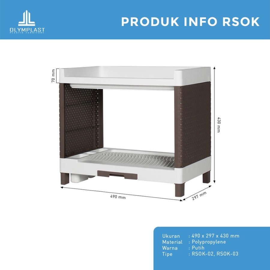 Spesifikasi: - Merek: Olymplast - Tipe: RSOK 2 - Rak piring susun 2 - Sebelum dirakit: 49 x 29 x 23cm - Setelah dirakit: 49 x 29 x 43cm - Mudah dirakit