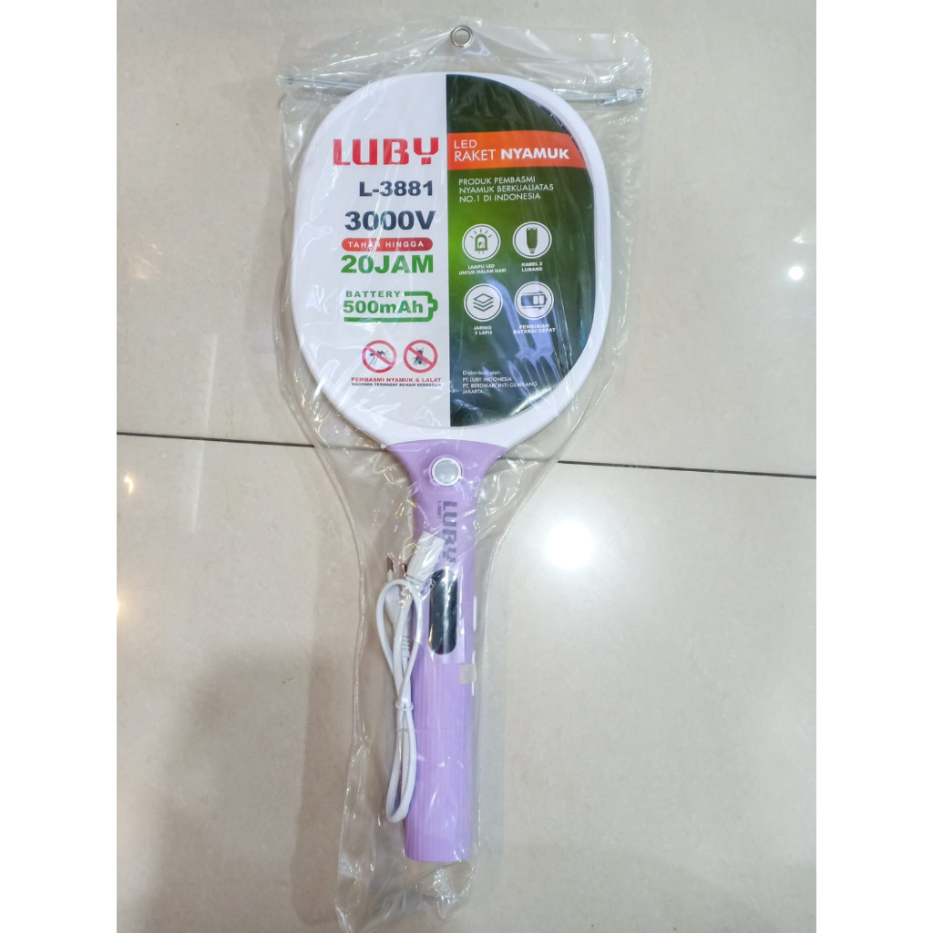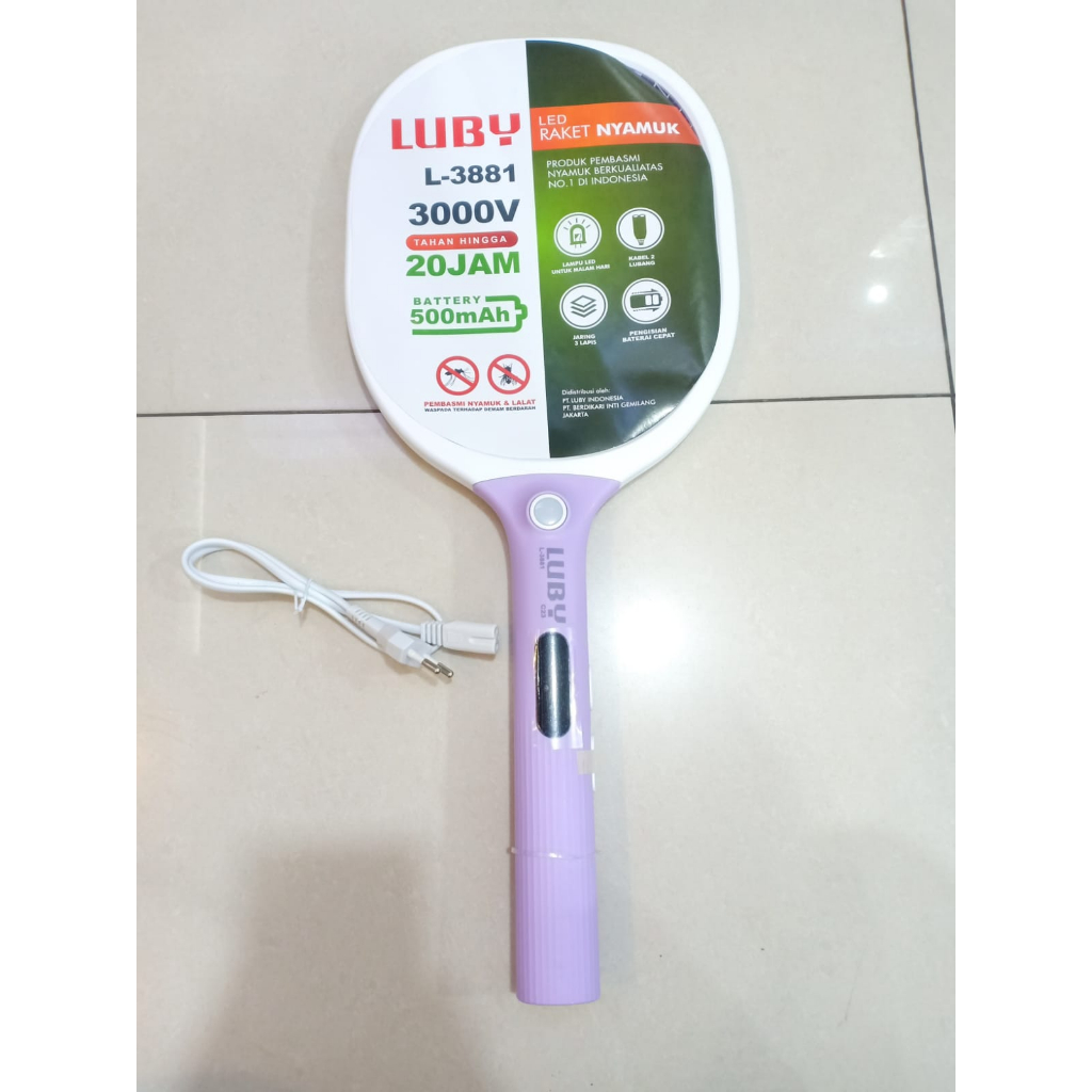 Spesifikasi : - Merk : Luby - Tipe : L-3881 - Tahan hingga 20 jam - Baterai : 500mAh - Tegangan : 3000V - Jaring 3 lapis pengaman - Lampu LED untuk malam hari - Pengisian baterai cepat kabel 2 lubang listrik - Bahan : Plastik ABS - Sudah dapat kabel cas - Pengisian cas 3-4 jam