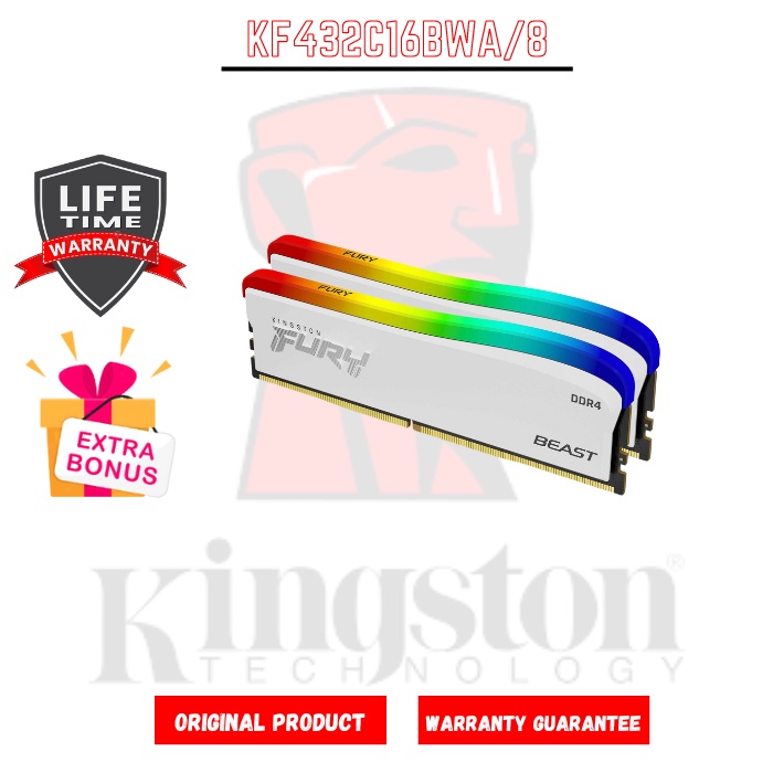 SKU KF432C16BWA/8 KF432C16BWAk2/16 Brand Kingston Memory Capacity 8GB Speed (Data Rate) 3200MHz (PC4-25600) Module Type DIMM Error Check Non-ECC Model/Series/Type Fury Beast CAS Latency CL16 Form Factor DDR4 Rank 1R (Single Rank) Warranty Lifetime Pins 288 Pin Colour Black Country of Origin China, Taiwan Operating Temperature 0°C to 85°C DRAM Density 16Gbit Memory Voltage 1.35v Memory Depth 2G Product Condition New Product Type/Family RAM Packaging Type Retail Data Width X64 Chip Organization x8 Memory Profiling XMP Heat Spreader Yes