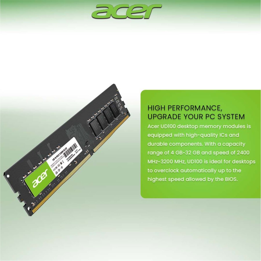 PRODUCT : ACER UD100 16GB PC2666MHz DEKSTOP DRAM Capacity : 16GB Type : 288-pin DDR4 dekstop memory modules Frequency : 2400Mhz / *2666 Mhz* / 3200 Mhz Latencies : CL17 / CL19 / CL 21 / CL22 Working : Voltage 1.2 V Dimensions : 133.25 x 31.25 x 3.90 mm Storage Temperature : -55 Celcius - 100 Celcius Working Temperature : 0-85 Celcius Limitied Warranty : Lifetime Warranty