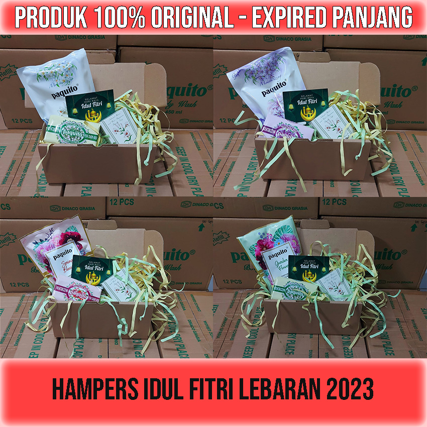 1 PAKET HAMPERS LEBARAN ISI : ✔ 1 Kartu Ucapan "Selamat Hari Raya Idul Fitri". ✔ 1 Box Hampers 20x10x10. ✔ 1 Sabun Paquito Refill 450ml (Bisa Pilih Varian). ✔ 1 Sabun Paquito Batang 120gr (Bisa Pilih Varian). ✔ 1 Sabun Paquito Batang Lys De France 90gr.