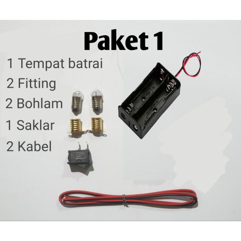 PAKET 1 Terdiri atas: * Bohlam 2 pcs (sudah kami cek nyala) * Kabel 60 cm (warna merah + hitam) * Fitting/tempat bohlam 2 pc * Tempat Batere AA 1pc * Saklar 1 pc