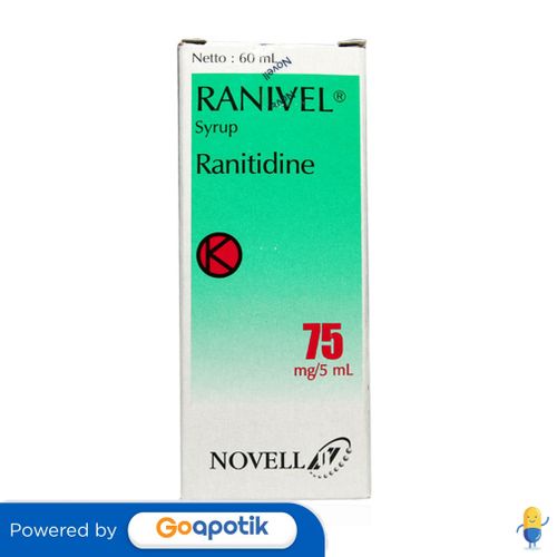 Deskripsi : PENGGUNAAN OBAT INI HARUS SESUAI PETUNJUK DOKTER. Digunakan untuk menghilangkan gejala dan penyakit yang disebabkan meningkatnya produksi asam lambung seperti tukak lambung, tukak usus 12 jari, sakit maag, nyeri ulu hati, gangguan pencernaan, dan hipersekresi patologis sehubungan dengan sindrom Zollinger-Ellison | Komposisi : Tiap 5 mL sirup mengandung ranitidine HCl 75 mg | Dosis : ATURAN PAKAI HARUS SESUAI DENGAN PETUNJUK DOKTER. Dewasa : Tukak duodenum aktif 150 mg 2 kali sehari atau 300 mg 1 kali sehari selama 4-8 minggu. Tukak lambung aktif 150 mg 2 kali selama 2 minggu. Tukak lambung dan duodenum Terapi pemeliharaan : 150 mg pada malam hari sebelum tidur. | Indikasi : Digunakan untuk menghilangkan gejala dan penyakit yang disebabkan meningkatnya produksi asam lambung seperti tukak lambung, tukak usus 12 jari, sakit maag, nyeri ulu hati serta gangguan pencernaan. | Perhatian Khusus : Ikuti semua aturan sesuai dengan anjuran dokter atau pakai sesuai yang tertera pada label. | Kemasan : Botol 60 mL sirup | NIE : DKL1033522737A1