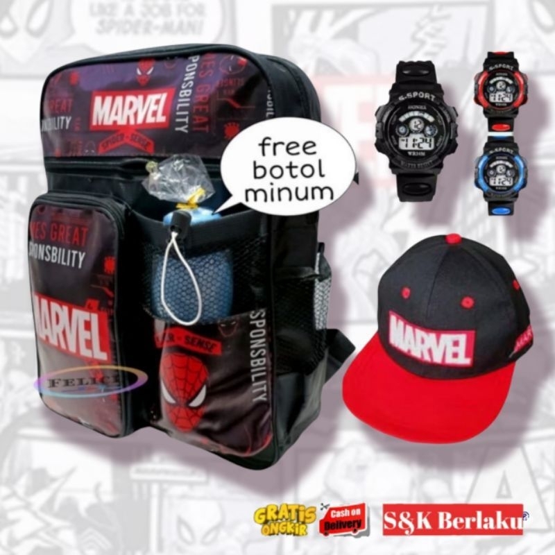Beli paket produck ini sudah dapet 4pc barang rincian barang: 1.ransel Marvel size besar 2.topi Marvel full printing 3.jam tangan digital warna random 4.waistbag/tas SLempang Marvel