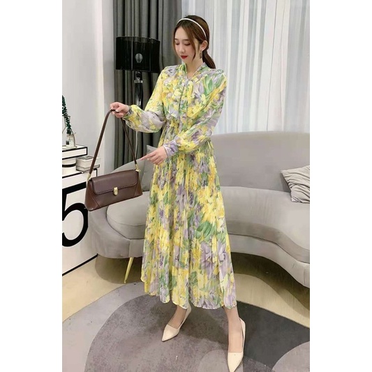 Detail [RARA]Maxi dress motif bunga panjang wanita plisket pita leher gamis muslim