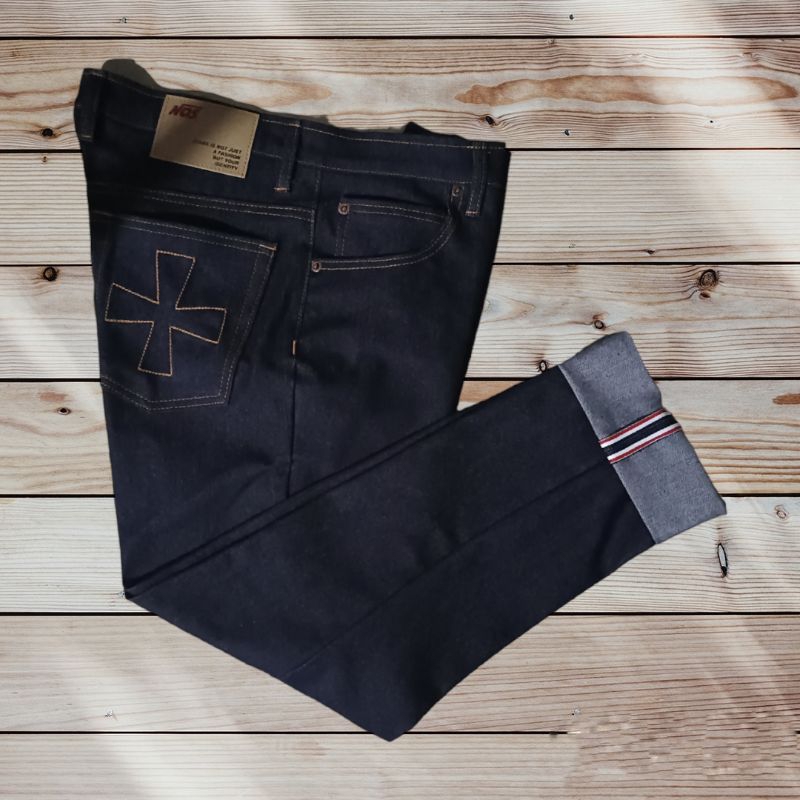 dibuat dari bahan raw denim yang berkualitas tinggi di klasnya, berkarakter setreatch, bisa fading, anti bakteri, resleting ykk, ukuran slim fit, ketebalan 14 oz.