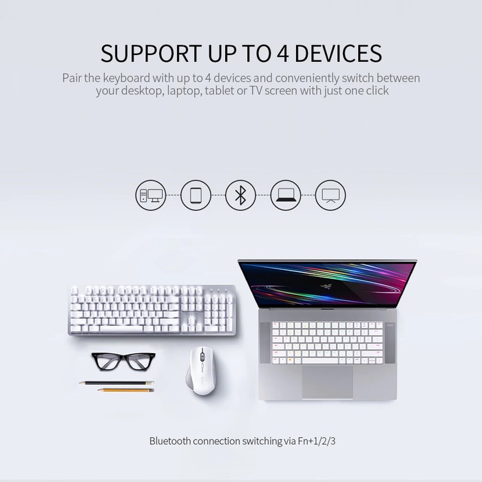 TECH SPECS Switch Type :Razer™ Orange Mechanical Switch Key Feel :Tactile and Silent Sizes :Full Size Lighting :True white LED backlighting Wrist Rest :None Onboard Memory :one Media Keys :None Passthrough :None Connectivity :2.4 Ghz Wireless / Bluetooth Keycaps :ABS plastic - With soft touch coating Others -80 million keystroke lifespan - Detachable USB-C braided fiber cable - Multi-host connection for up to 4 devices - Fully programmable keys with macro recording - Backlit keys (white LED) - 10-key rollover - Battery Life: Up to 12 hours on Bluetooth® and 2.4GHz with back-lighting on, or up to 84 hours without back-lighting on Bluetooth® and 78 hours on 2.4GHz - Metal top cover - Razer Synapse 3 enabled - Dimensions: 442 mm x 133 mm x 39 mm -Weight: 900 g without packaging - Cable length: 2 m