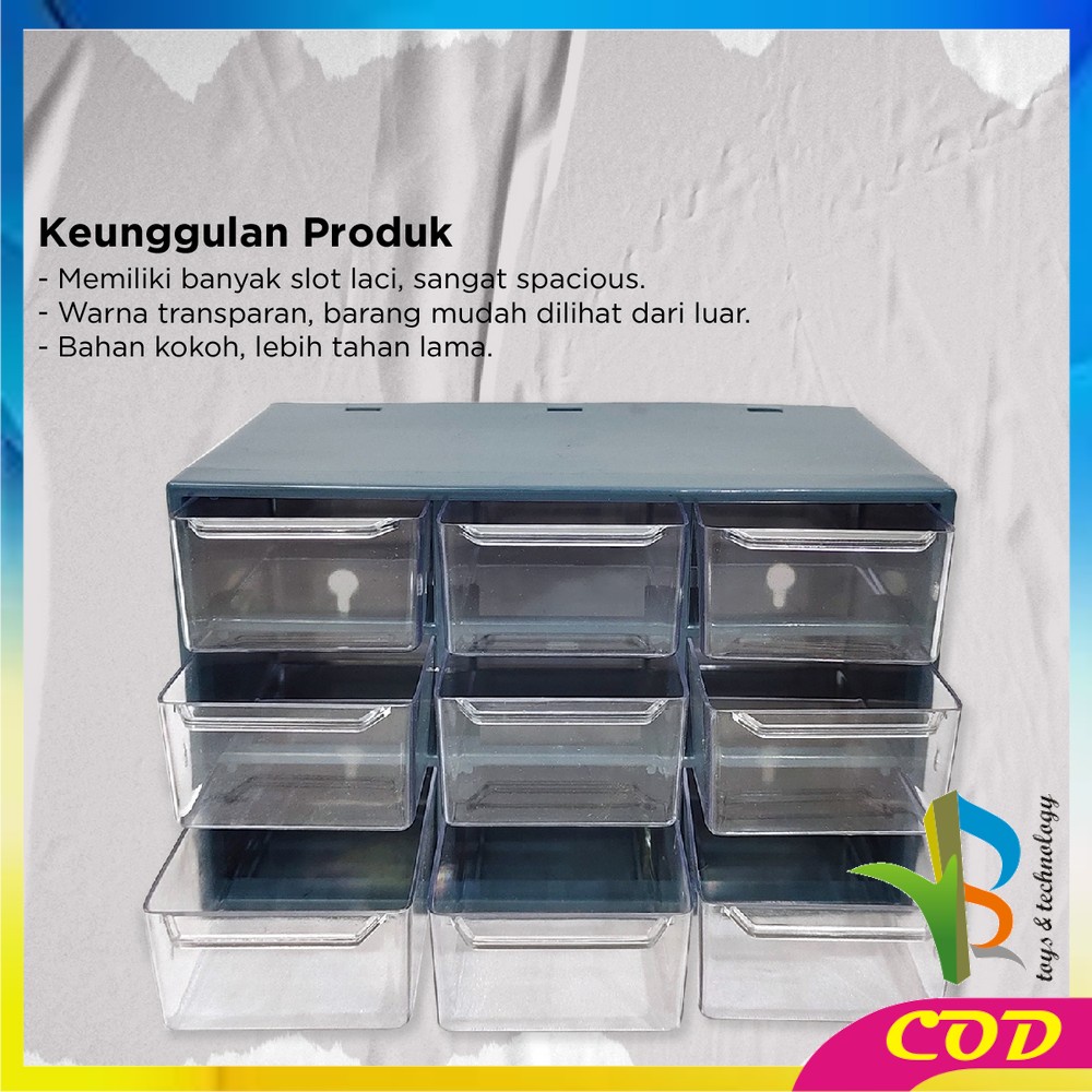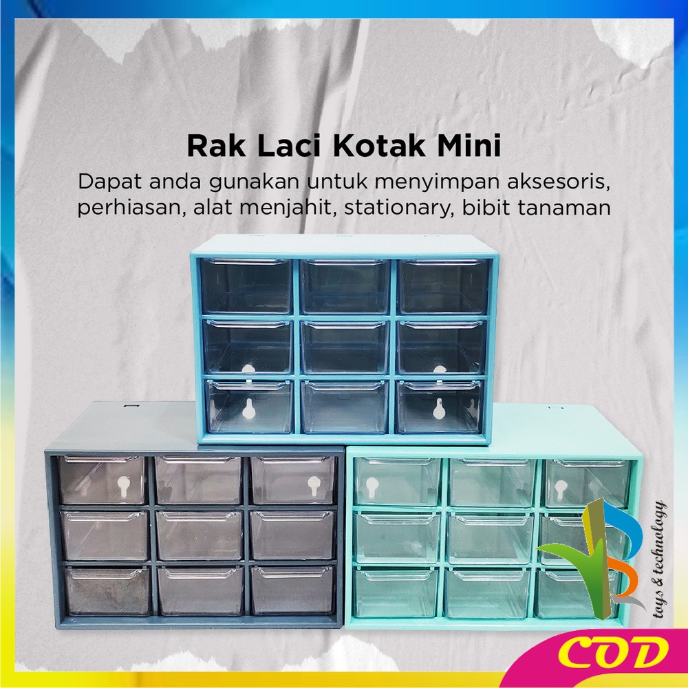 Deskripsi Produk: Rak Laci kotak mini ini memiliki 9 sekat yang dapat anda gunakan untuk menyimpan aksesoris, perhiasan, alat menjahit, stationary, bibit tanaman, organizer stationary dan lainnya sesuai dengan keinginan anda.