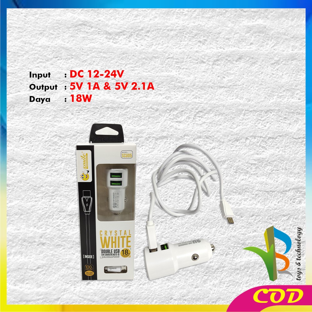 Spesifikasi : - Bahan : Plastik - Ukuran P x L : 5.5x 2,3cm - Panjang Kabel : ±100cm - Model : CC201 - Port : Dual USB - Color : Black/White - Input : DC 12-24V - Output : 5V 1A & 5V 2.1A - Daya : 18W