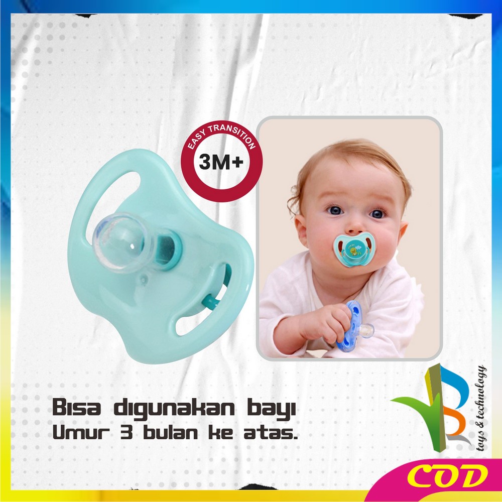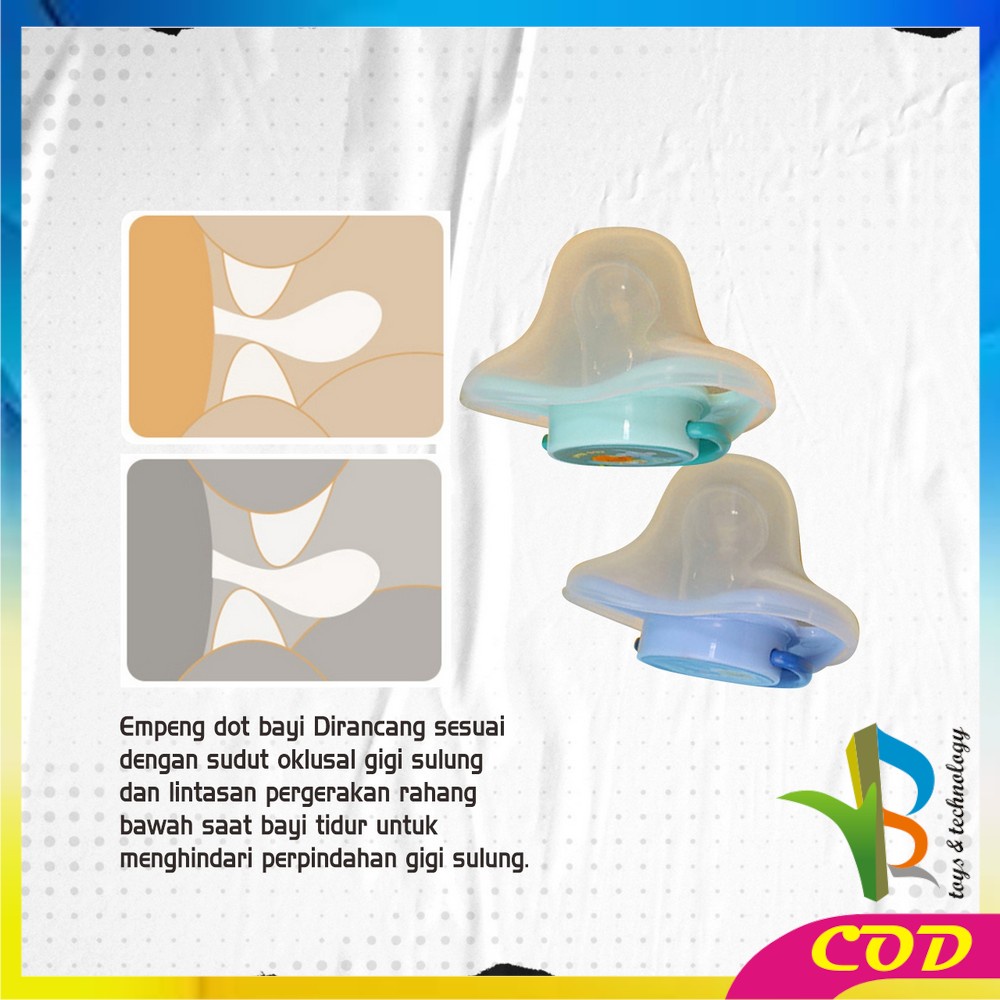Empeng dot bayi Dirancang sesuai dengan sudut oklusal gigi sulung dan lintasan pergerakan rahang bawah saat bayi tidur untuk menghindari perpindahan gigi sulung.
