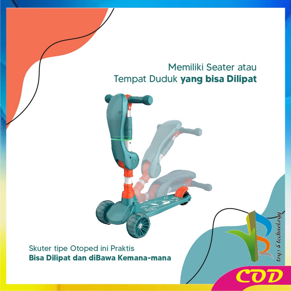 Deskripsi Produk: Hibur anak kecil Anda dengan skuter yang asyik ini. Didesain dengan roda yang dapat menyala, memiliki seater atau tempat duduk yang bisa dilipat. Dengan Konsep SIT AND RIDE. Skuter tipe otoped ini praktis karena bisa dilipat dan dibawa kemana- mana. Memiliki roda 3 yang lebar dan menyala sehingga tidak oleng dan aman untuk anak- anak. Cara membelokan scooter duduk pijakan di injak sesuai arah yg ingin di belokan berbarengan dengan stang nya juga. Skuter ini memikat dan mengasyikkan untuk dimainkan. Yang paling penting, desainnya yang aman untuk anak-anak yang mencakup pegangan anti-selip, ketinggian stang dapat diatur menyesuaikan tinggi anak dan rem belakang yang lebar, memastikan anak Anda menikmati waktu bermain mereka dengan senyum cerah!