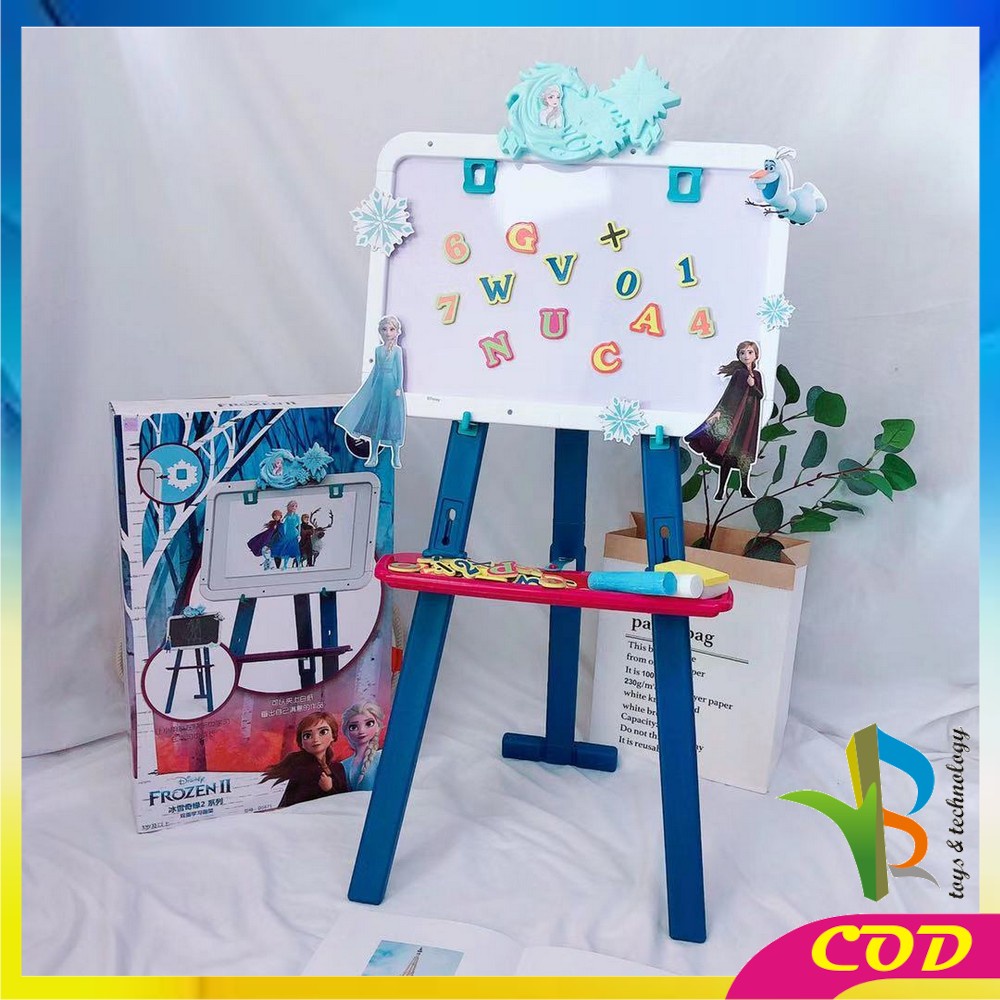 * Terdiri 2 sisi papan tulis : White board dan Black board * Dilengkapi block magnet alphabet abjad, angka , simbol, dan fozen Elsa * Dilengkapi kapur tulis 2pcs dan penghapus * Dapat ditulis dengan menggunakan spidol & menempel angka/huruf magnetic (White Board) * Dapat ditulis dengan menggunakan kapur tulis (Black Board) * Papan ini juga bisa di Adjust Tempat Papan Tulis dari tinggi 45CM sampai 65 CM