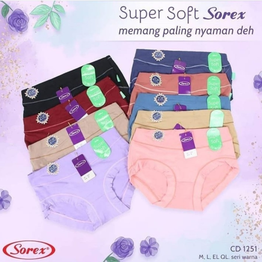 CD SOREX 1251 SUPER SOFT Collection by Sorex high waist, karet tebal, nyaman dipaha, bahan soft banget.. Bahannya lembut banget, serta adem dan stretch. .Celana dalam wanita merek Sorex kode 1251 terbuat dari bahan Super Soft (super halus) yang super nyaman, sangat lembut dan halus dan harga yang sangat murah juga membuat CD 1251 Sorex ini sangat disukai para wanita. Bahan Supersoft dari katun yang sangat lembut dan berkualitas terasa sangat halus juga lembut di badan, sangat adem dan nyaman dipakai sehingga cocok untuk dipakai sepanjang hari maupun beraktifitas sehari-hari.
