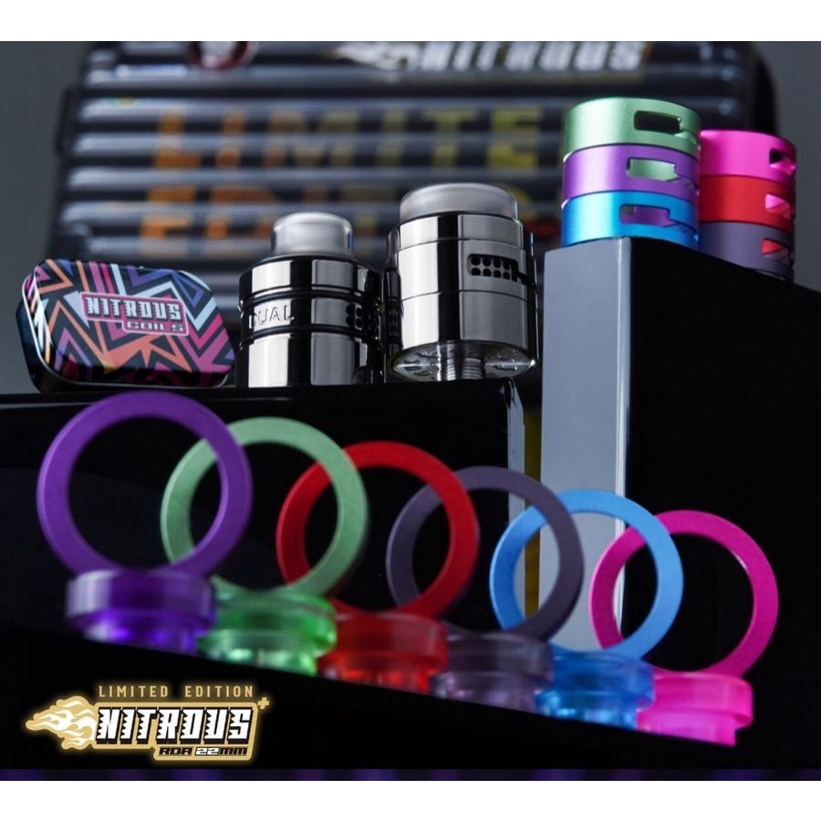 paket itu terdiri dari - 1.00 NITROUS RDA 22MM LIMITED EDITION - 1.00 NITROUS ALIEN COIL BABY ALIEN 0.2 OHM - 7 Warna AFC Ring - 7 Beauty Ring - 7 810 Drip tip