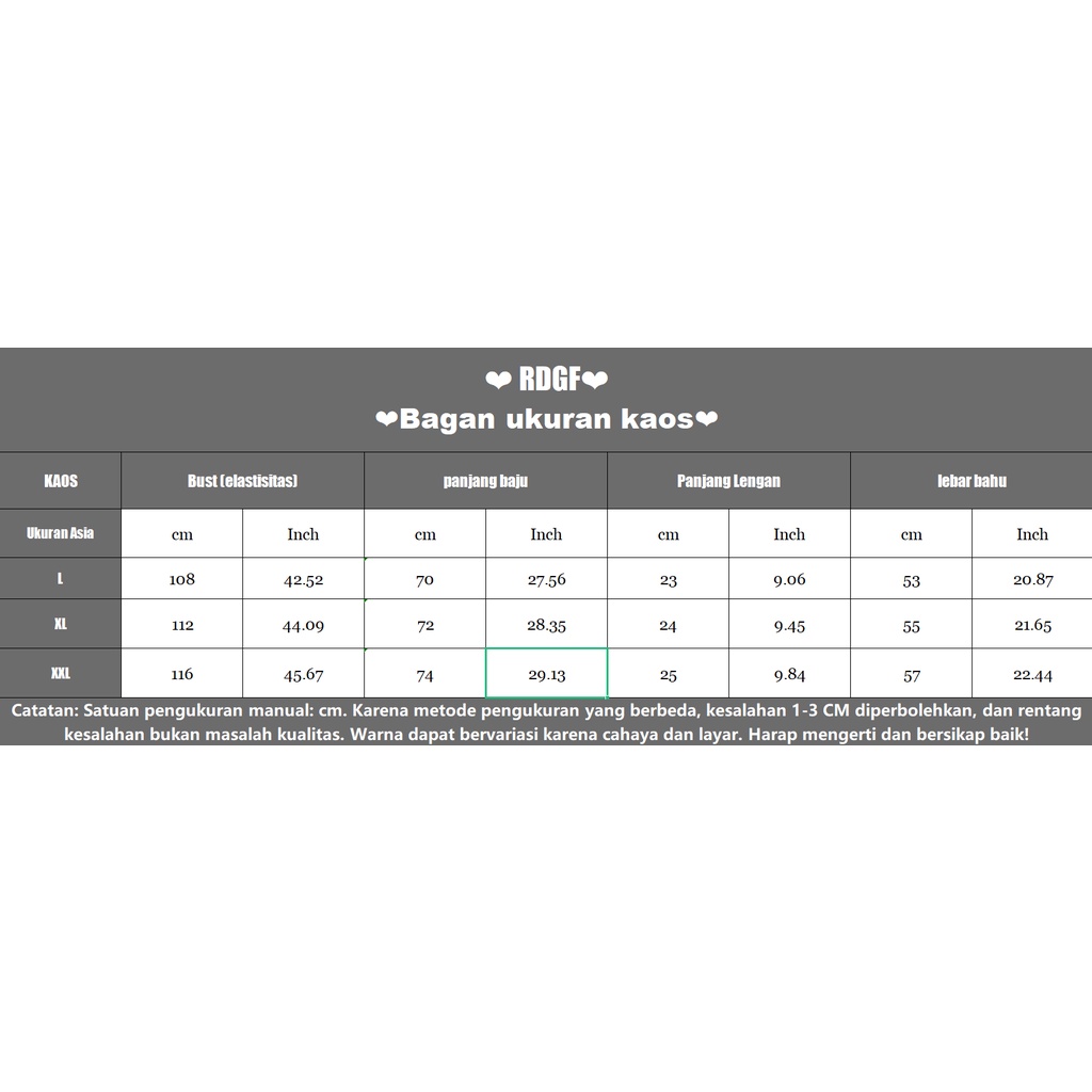 [ukuran pakaian] L Panjang 70 Dada 108 Lengan 23 Bahu 53 XL Panjang 72 Dada 112 Lengan 24 Bahu 55 XXL Panjang 74 Dada 116 Lengan 25 Bahu 57