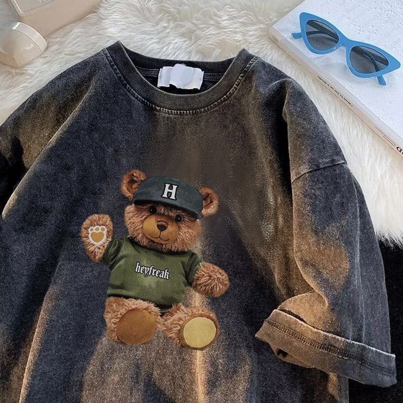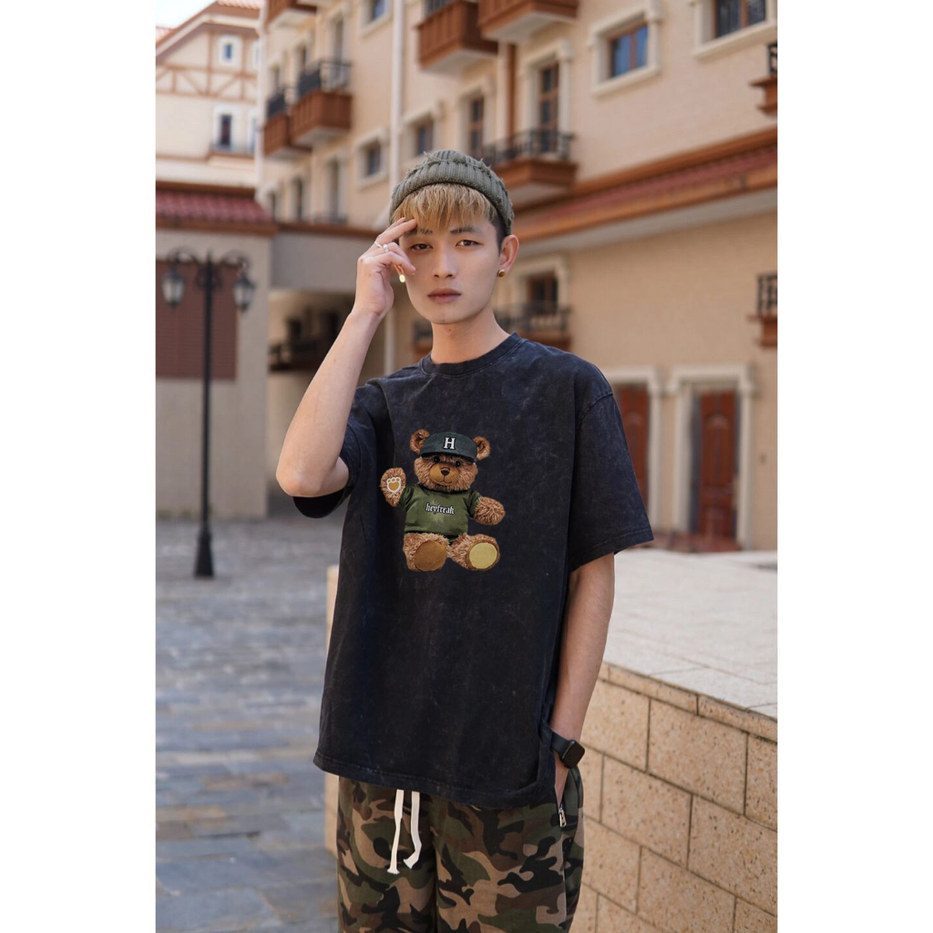 Detail RDGF Washed oversized kaos pria keren teddy bear shape T-shirt kaos hitam pria black washed tshirt kaos cowok keren/A0903