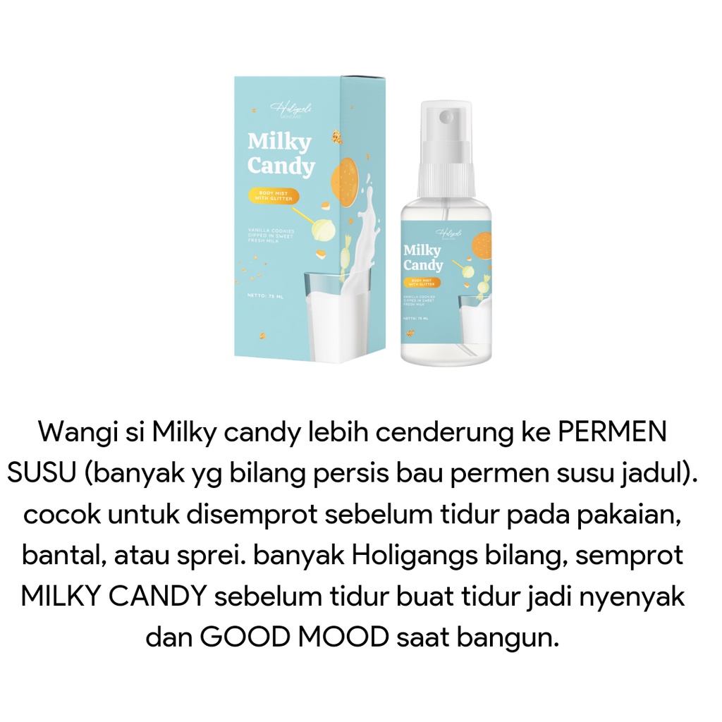 -Milky Candy = Sweet, tapi lebih soft dibandingkan si Vanilla Eclair. Wangi si Milky candy lebih cenderung ke PERMEN SUSU (banyak yg bilang persis bau permen susu jadul). cocok untuk disemprot sebelum tidur pada pakaian, bantal, atau sprei. banyak Holigangs bilang, semprot MILKY CANDY sebelum tidur buat tidur jadi nyenyak dan GOOD MOOD saat bangun.