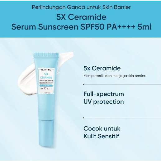 Sunscreen dengan kandungan utama 5X Ceramide yang dapat memperbaiki dan mengembalikan skin barrier. Dilengkapi UV Filter jenis terbaru yang telah dipatenkan oleh BASF Germany (Tinosorb S/M) yang dapat melindungi kulit dari sinar UVA & UVB serta Blue Light, dengan SPF 50+ PA++++ tanpa mengiritasi kulit. Memiliki tekstur ringan yang menyerap dengan cepat, tidak berminyak & memberikan hasil akhir yang melembabkan. Tambahan kandungan Hyaluronic Acid yang dapat mengembalikan dan mengunci kelembaban pada kulit
