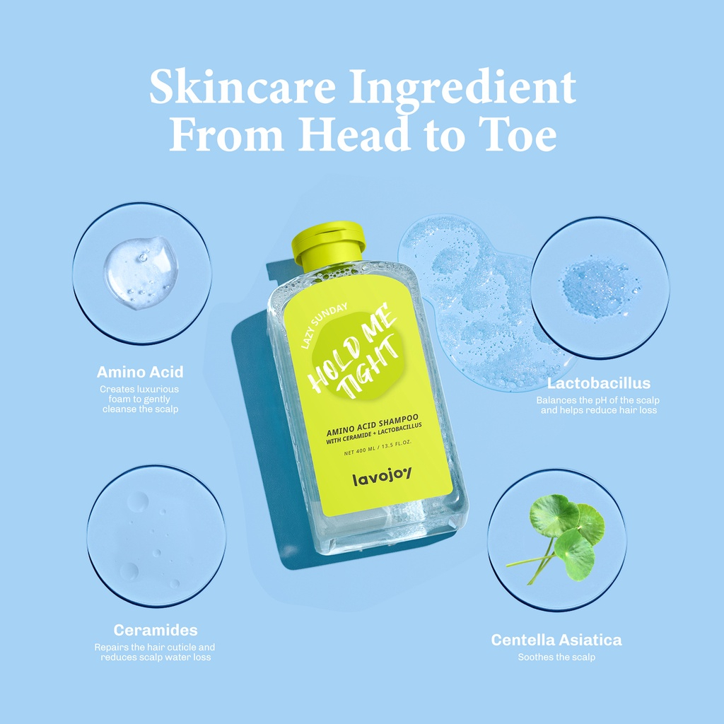 Spesial ingredients: Amino Acid: Memberikan busa krim sambil memberikan pembersihan lembut pada kulit Lactobacillus: Menyeimbangkan pH kulit kepala dan membantu mengurangi kerontokan rambut Ceramides: Memperbaiki kulit rambut yang mati dan mengunci air di kulit kepala Centella Asiatica: Menenangkan kulit kepala