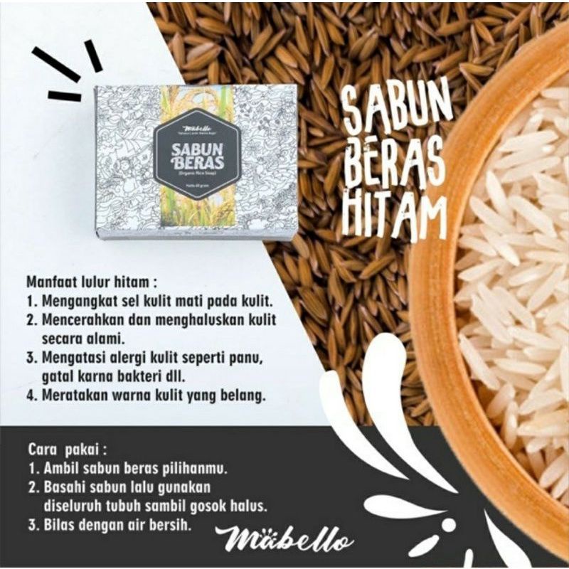 khasiat sabun mabello - meluruhkan selulit - membantu memudarkan bekas luka - meluruhkan sel kulit mati/kusam -membantu meredakan gatal-gatal seperti jerawat wajah /punggung -aman untuk wajah & seluruh tubuh -terbuat dari beras, minyak zaitun san rempah-rempah tanpa kandungan SLS