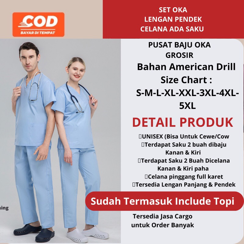 1. Bahan American drill 2. Lengan pendek kerah v neck & terdapat 2 kantong DI BAJU BAGIAN BAWAH 2 KANTONG 3. Celana full karet di pinggang CELANA saku 2 4. Penutup kepala & masker