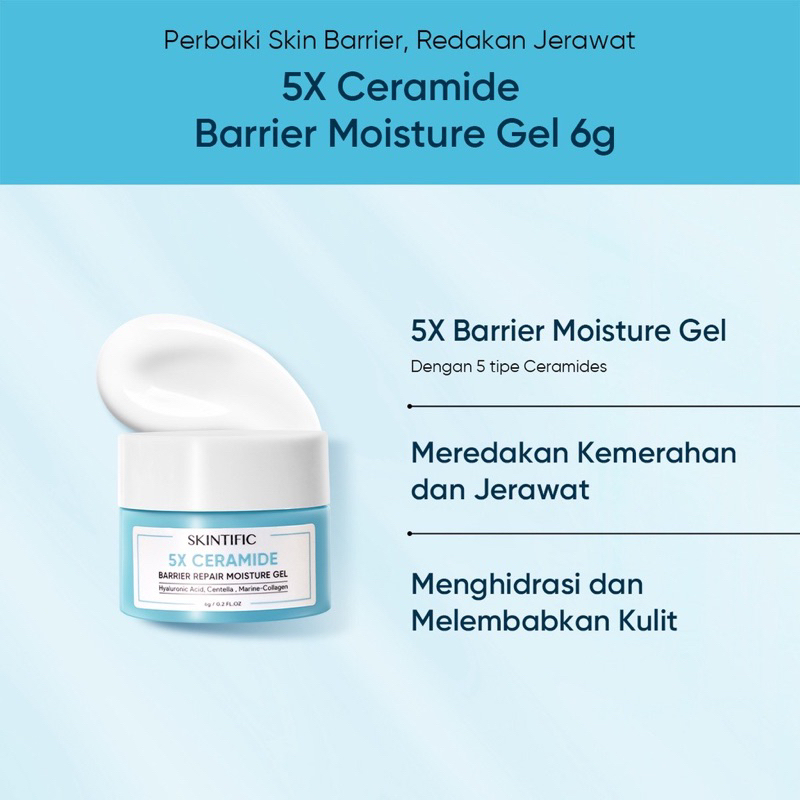 Moisturizer yang menggabungkan 3 kandungan aktif Ceramide, Hyaluronic Acid, dan Centella Asiatica, untuk mengatasi permasalahan skin barrier yang rusak seperti jerawat, kemerahan, kulit bertekstur, dan juga kulit kering secara cepat namun tetap aman untuk skin barrier.