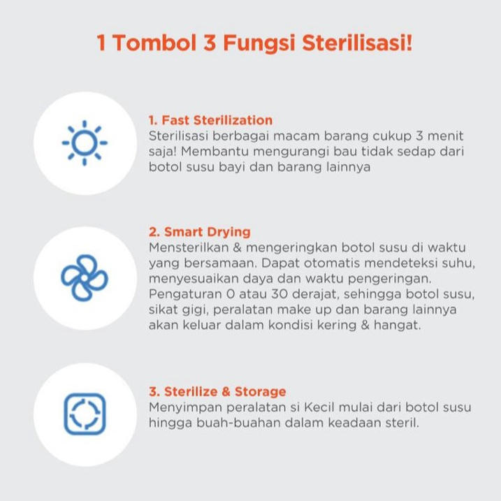 ✅ 3in1. Selain mensterilkan dapat digunakan untuk mengeringkan dengan fungsi dryer/pengering. Dapat pula menjadi tempat penyimpanan sebelum perlengkapan digunakan