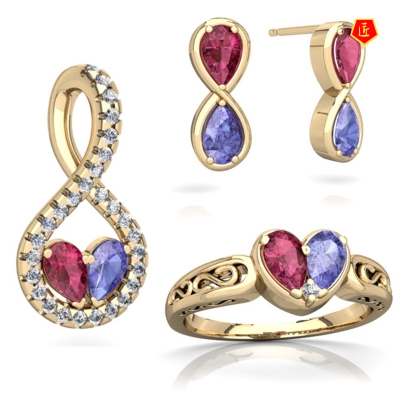 Detail [Ready Stock]Creative Heart-Shaped Ring Red Purple Zircon Ear Stud Necklace Set