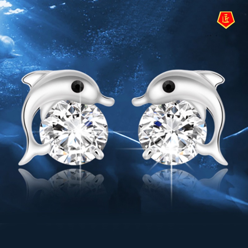 Detail [Ready Stock]Silver Dolphin Diamond Stud Earrings Korean Style Fashion