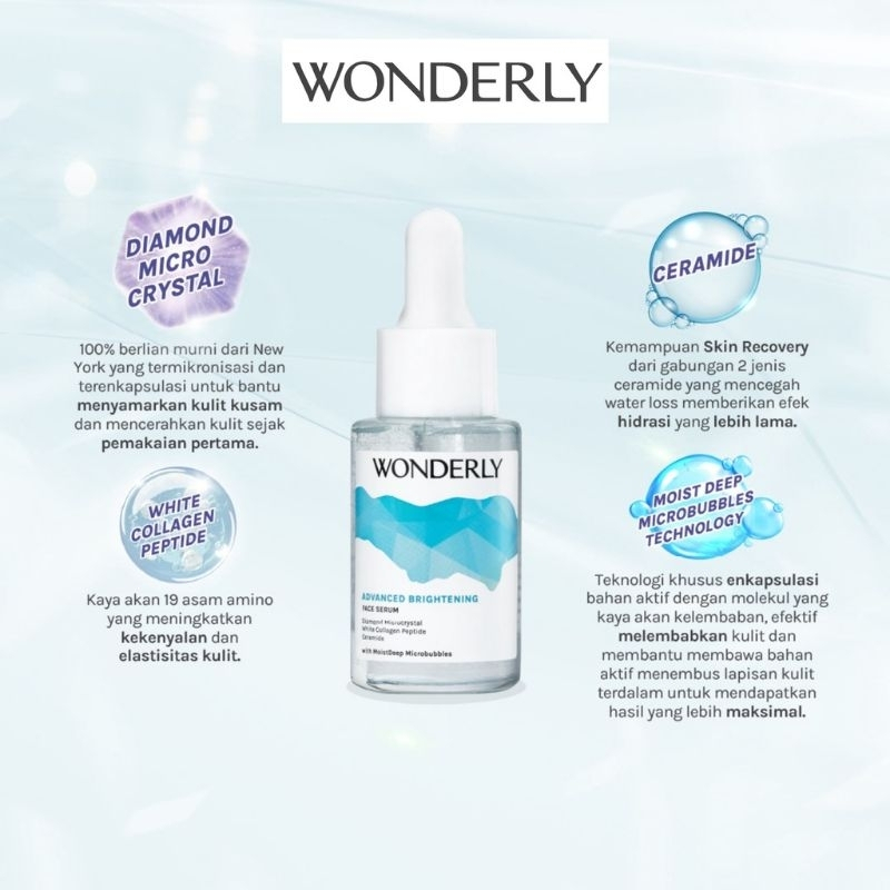 Wonderly Advanced Brightening Face Serum 15 ml Merupakan serum pencerah untuk kulit halus cerah berkilau dalam 1 malam, dan bintik hitam/ dark spot tersamarkan dalam 7 hari pemakaian.