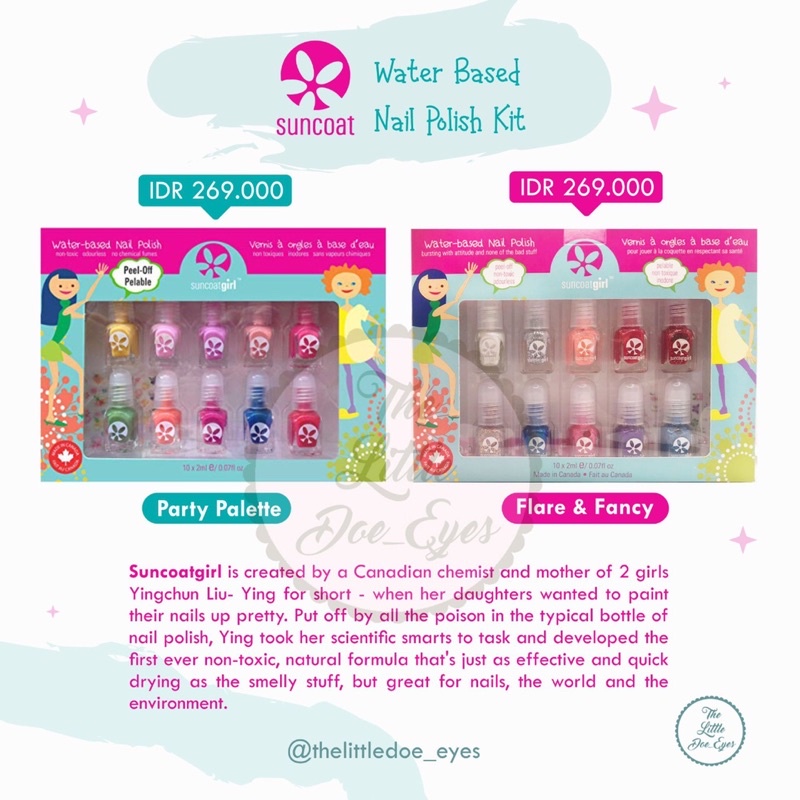 Mommies⠀ ..⠀ Si kecil lagi centil-centilnya ikutan mamanya mani-pedi biar kukunya ikutan cantik😂 pasti ngegemesin banget ya liat si kecil jadi seneng memperhatikan penampilan🥰🥰 tapi mani-padi yang ada di salon atau produk yang kita pake belum tentu cocok loh untuk si kecil. Gapapa moms jangan batasi si kecil untuk terus belajar hal yang baik seperti memperhatikan penampilan. Semua pasti ada solusinya😉⠀ .. ⠀ SunCoatGirl, Water-Based Nail Polish Kit yang satu ini cocok banget buat si kecil yang suka banget mani-pedi karena formula dibuat khusus untuk si kecil agar tetap aman dipakai. Ada 10 warna party pallete yang bisa si kecil pakai, tahan beberapa lama dan gak berbau. Produk ini ga pake bahan kimia jadi gaakan membuat kulit si kecil jadi kekuningan saat setelah dipakai, dia akan mengelupas dengan sendirinya jadi ga perlu nails polish remover ya moms💅🏻⠀ ..⠀ What’s Included?⠀ - 10 pcs nail polish - Nail File⠀ - One Decal Sheet .. 269.000