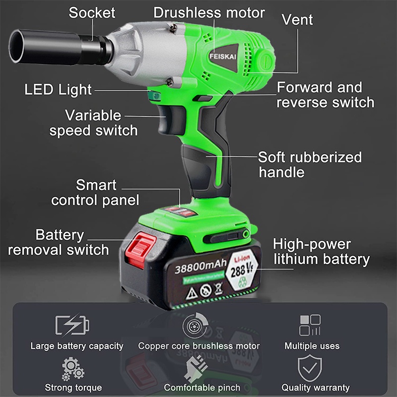 CORDLESS IMPACT WRENCH MEREK PRODUK : Merk REAIM Reaim-ddbs001 KECEPATAN 0- 3300 RPM Max torque 520Nm =================== π1*mesin kunci pas tanpa kabel π2* baterai atau 1* baterai π1*pengisi daya π Aksesori berikut harus memilih model yang sesuai πIkuti gambar dan instruksi π1*soket ukuran 22mm π1*ukuran soket 19mm π1*bor π2*adaptor π1*mata obeng π1*Pelumas π1*bor memutar π1*kotak plastik =================== Keunggulan + Fitur: - Putaran Kiri atau Kanan - Mode Percepatan - Kualitas premium harga bersahabat - Mesin tidak cepat panas - Terbaik di kelasnya