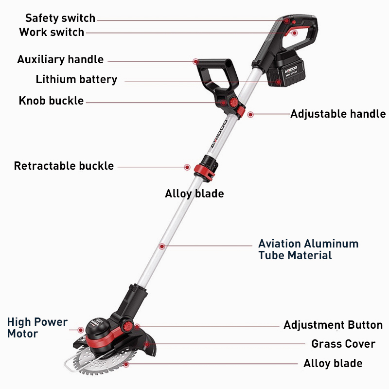 ๐grass cutter Buying guide Product Name: Mesin potong rumput Color: Black/red Material: ABS+ stainless steel + aluminum Input voltage: 100-240V Production: German craft Engine power: 450W-2000W high power Kecepatan tanpa beban: 22000-25000 rpm Saw blade size: 7"