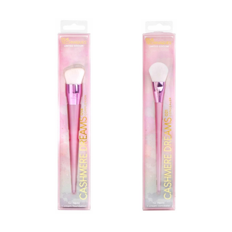 PRODUCT FEATURES: - Cashmere Dreams Complexion Brush (014) : Dense, domed bristles buff cream or liquid foundations for an even coverage. Use with: liquid foundation and cream foundation. - Cashmere Dreams Concealer Brush (021) : Soft, dense brisltes help layer cream or liquid concealer to blur blemishes and imperfections. Use with: liquid concealer and cream concealer.