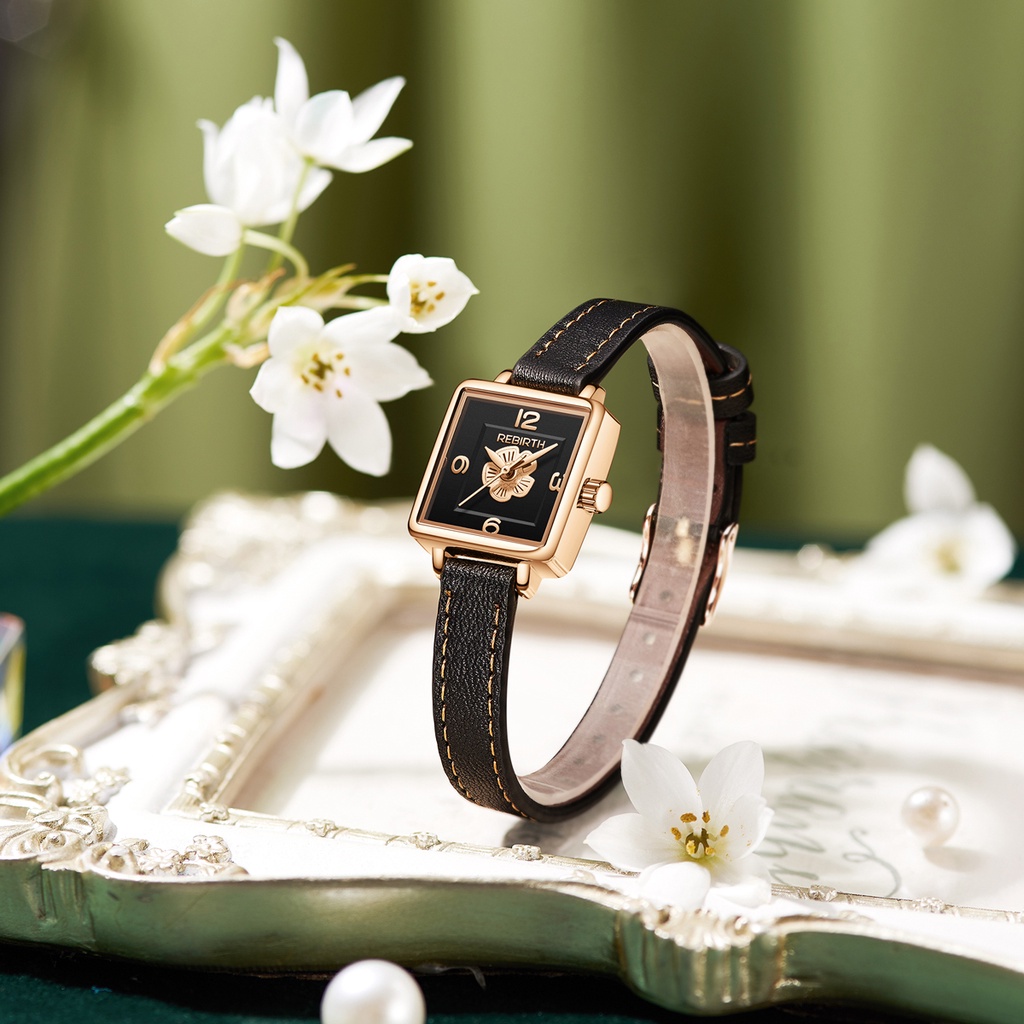 Detail REBIRTH Jam Tangan Wanita Anti Air Desain Dial Persegi Kecil Mode Vintage Tali Kulit Kuarsa Jam Tangan Cewek
