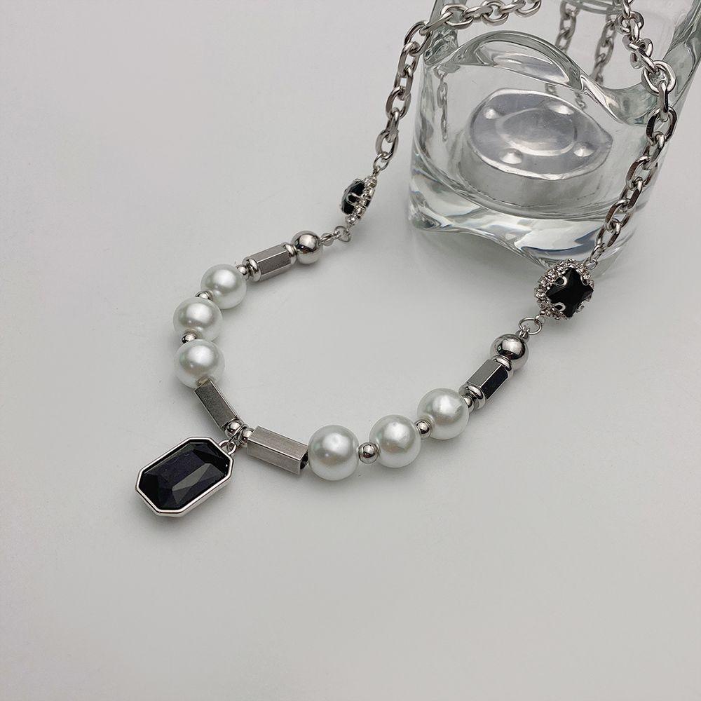 Rebuy Kalung Mutiara Punk Pesta Elegan Liontin Permata Hitam Gaya Angin Dingin Perempuan Rantai Klavikula