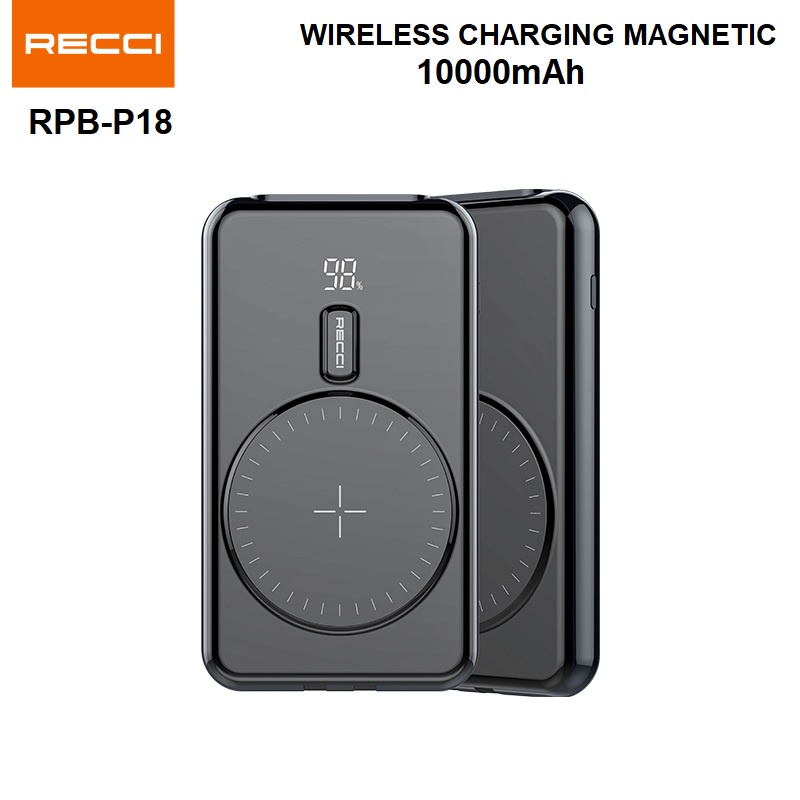 Specification Brand: RECCI Product Name: Wireless Charging Magnetic Product Type: Power Bank Product Model: RPB-P18 Battery Capacity: 10000mAh/38.5Wh Rated Capacity: 5800mAh (5V/2.1A) Battery Cell Type: A+ Grade Lithium Polymer Battery Input Port (Type-C): 5V=3A/9V=2A Input Port (Micro USB): 5V/2A Input Cable (Type-C): 5V=3A/9V=2.22A Output Port (USB-A): 5V=4.5A/5V=3A/9V=2A/12V=1.5A Output Cable (USB-C): 5V=3A/9V=2.22A/12V=1.67A Output (Lightning): 5V/2.4A Output Wireless: 5W/7.5W/10W/15W (MAX)
