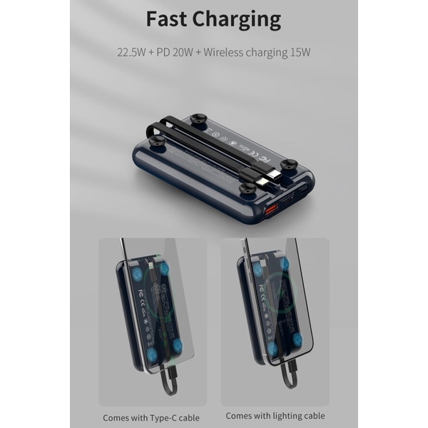 Main Features: - Built-in Cables (Lightning & Type-C) - USB-A Output (Fast Charging 22.5W MAX) - Support PD 20W - Support Wireless Charging (15W MAX) - Multiple Safety Protection - Not Easy to Slip