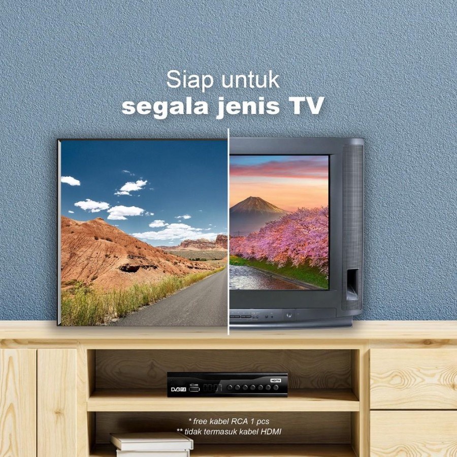 Fitur: - Menggunakan Antena UHF (antena TV Biasa) - Gambar tanpa semut atau bayang. Kualitas gambar setara TV Kabel berlangganan dan sangat stabil. - Mendukung format resolusi 1080p, 1080i, 720p, 576p, 576i, 480p, 480i - Aspec Ratio : 4:3 dan 16:9 - Multi Bahasa OSD - Port HDMI, USB 2.0, RCA, dan RGB (Sebaiknya beli dan gunakan HDMI untuk TV LED/LCD/Plasma) - Bisa Dipakai di SEMUA JENIS DAN MERK TV TABUNG, LCD, LED, Plasma - Bisa Merekam Siaran TV (tinggal colok flashdisk atau HDD eksternal) - Bisa menjadi media player untuk film, foto, dan musik. - Format yang bisa dimainkan: MKV, AVI, MP4, MPG, VOB, TS, TRP, DAT, JPEG, JPG, BMP, MP3, WAV, OGG - Mendukung format penyimpanan NTFS, FAT32, FAT16 - Mendukung Multimedia - Foto : JPEG, BMP, PNG - Audio : WMA, MP3, ACC - Video : MPEG1, MPEG2 (mp2), MPEG4 (mp4), H264, MOV, MKV, AVI, DIV - EWS (Early Warning System/Peringatan Bencana Dini) - EPG (Electronic Program Guide) - LCN (Logical Channel Number) - IR Remote Control - Body dari bahan metal