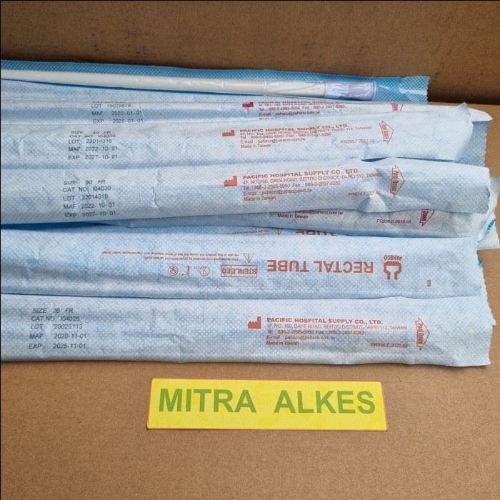 Spesifikasi : 1. Ujung kerucut kateter yang halus memudahkan pemasangan ke dalam rektum (atraumatik) 2. Dua mata lateral untuk drainase yang efisien 3. Konektor ujung proksimal bentuk corong untuk memudahkan koneksi ke peralatan penghisap 4. Konektor kode warna untuk idetifikasi ukuran yang mudah dan tepat 5. Material PVC mutu medis dan tidak menyebabkan iritasi (siliconized latex) 6. Panjang tube : 400 mm / 40 cm