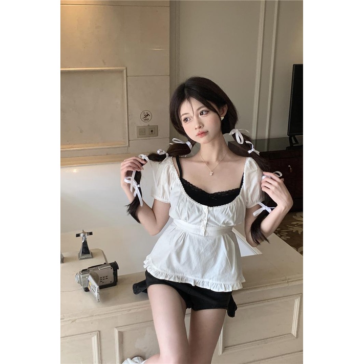 Fashion Muslim > Atasan Muslim Wanita > Kemeja, Blouse, & Dalaman Blouse > Red 08#Tembakan Nyata Hemat Biaya Kemeja Lengan Pendek Puff Renda Prancis+Atasan Slip Kecil dengan T