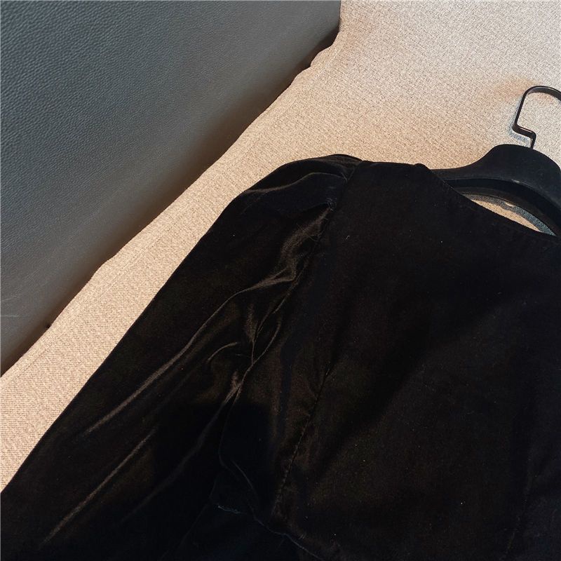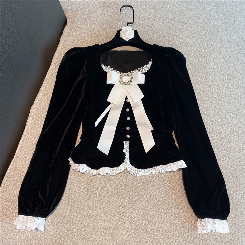 Pakaian Wanita > Batik > Atasan Batik > Red 2021 Musim Semi Baru Bahasa Perancis Temperamen Wanita Gaya Asing Tepi Renda Berlian Imitasi Tombol Renda Lengan Emas Beludru Top Wanita