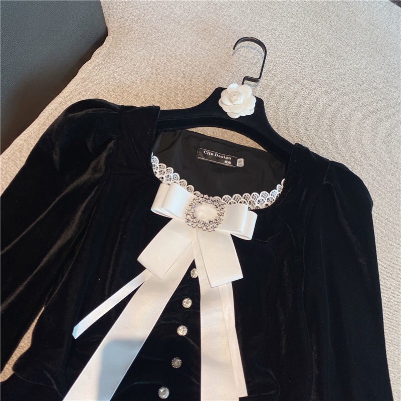 Detail Red 2024 Musim Semi Baru Bahasa Perancis Temperamen Wanita Gaya Asing Tepi Renda Berlian Imitasi Tombol Renda Lengan Emas Beludru Top Wanita