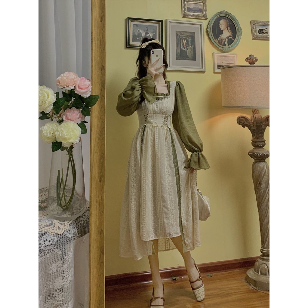 Detail Red 2022 Baru Awal Musim Gugur Hijau Retro High-End Gaun Niche Slim Pinggang Jahitan Lengan Panjang Dewi Gaun