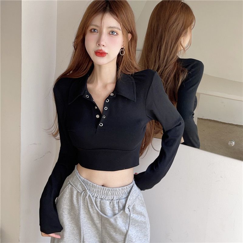 Detail Red 2022 Musim Gugur Baru POLO Kerah Slim Fit Gadis Panas Kemeja Wanita Sederhana Manis Gaya Keren Tombol Lengan Panjang atasan Pendek